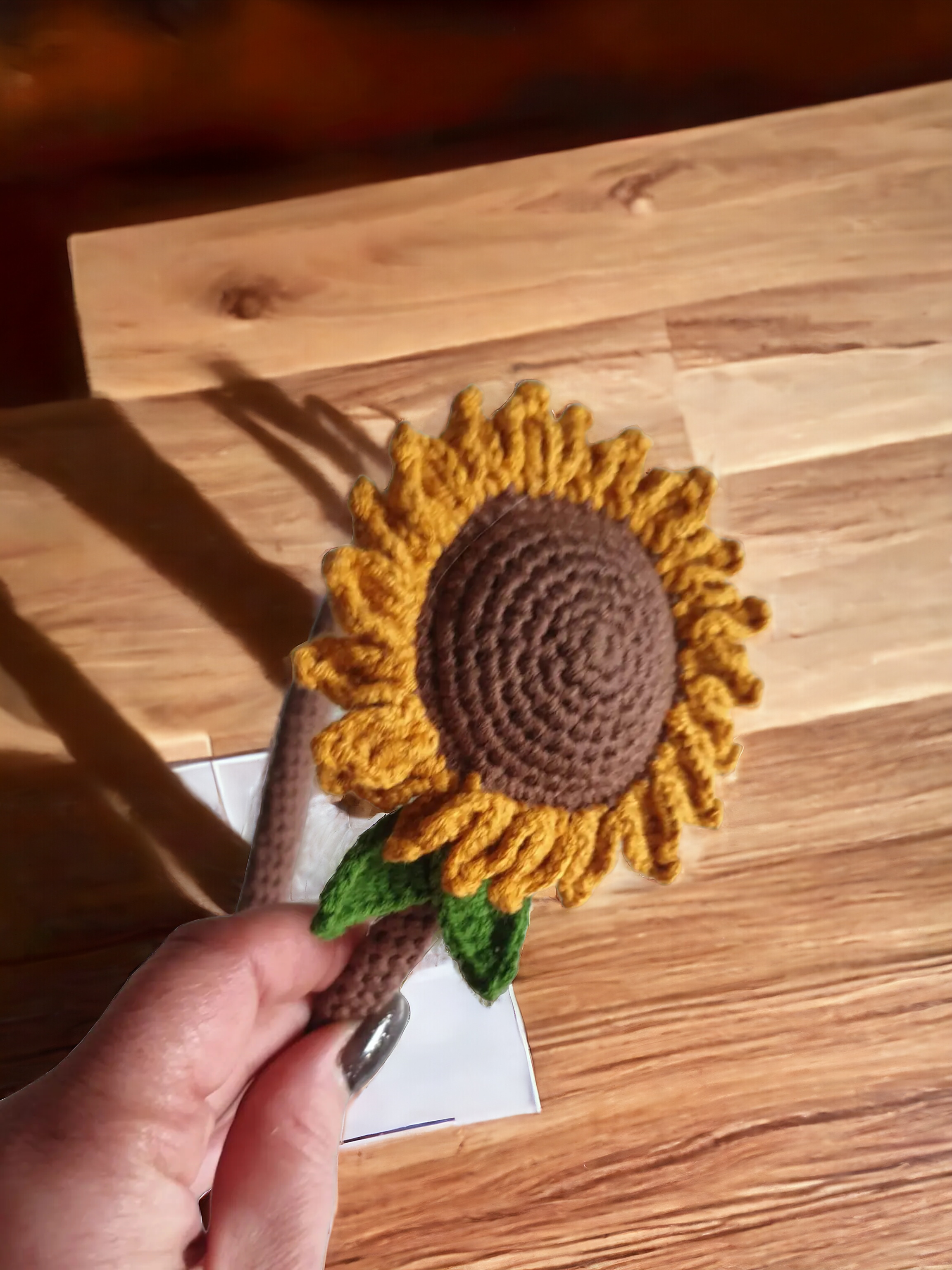Amigurumi tekniği ile örülmüş ay çiçeği figürlü çocuk tacı