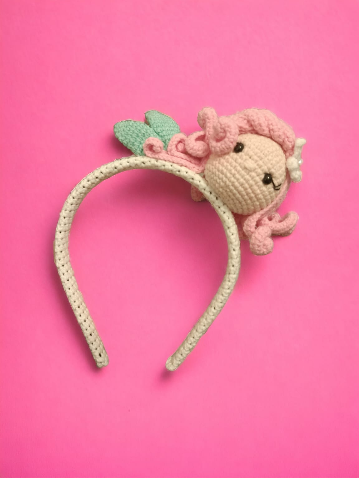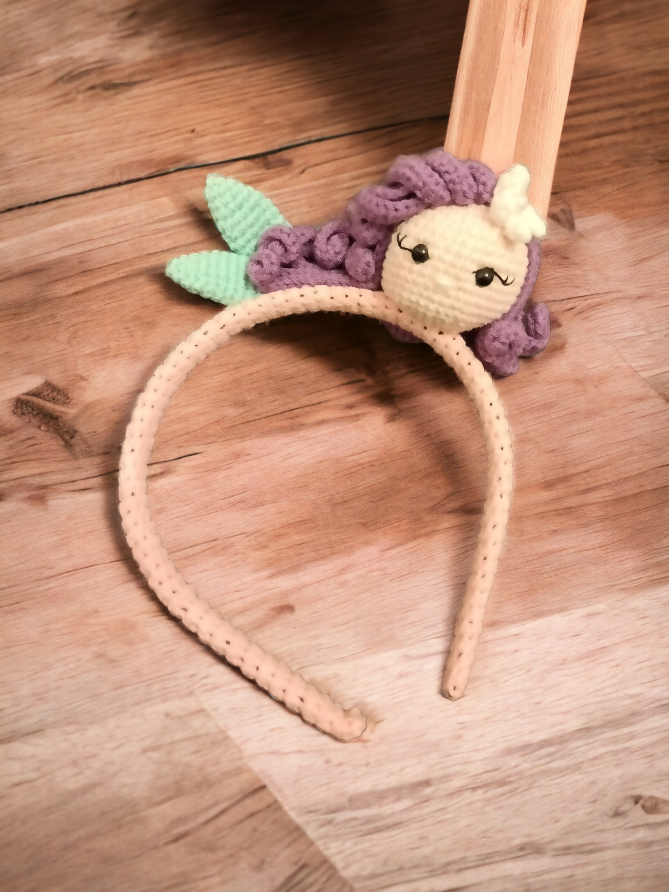 Amigurumi tekniği ile örülmüş deniz kızı figürlü çocuk tacı