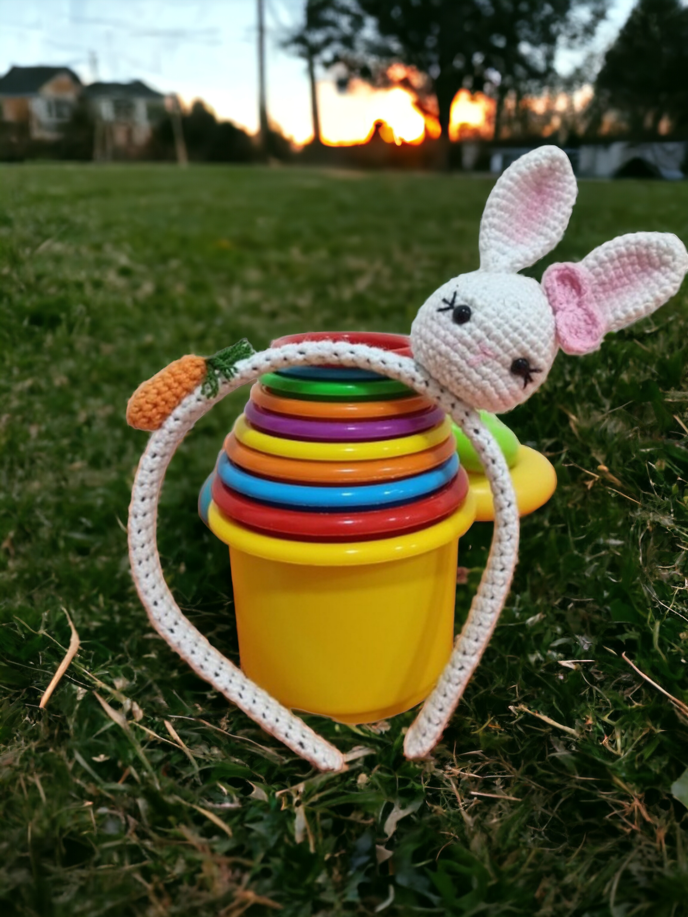 Amigurumi tekniği ile örülmüş tavşan figürlü çocuk tacı