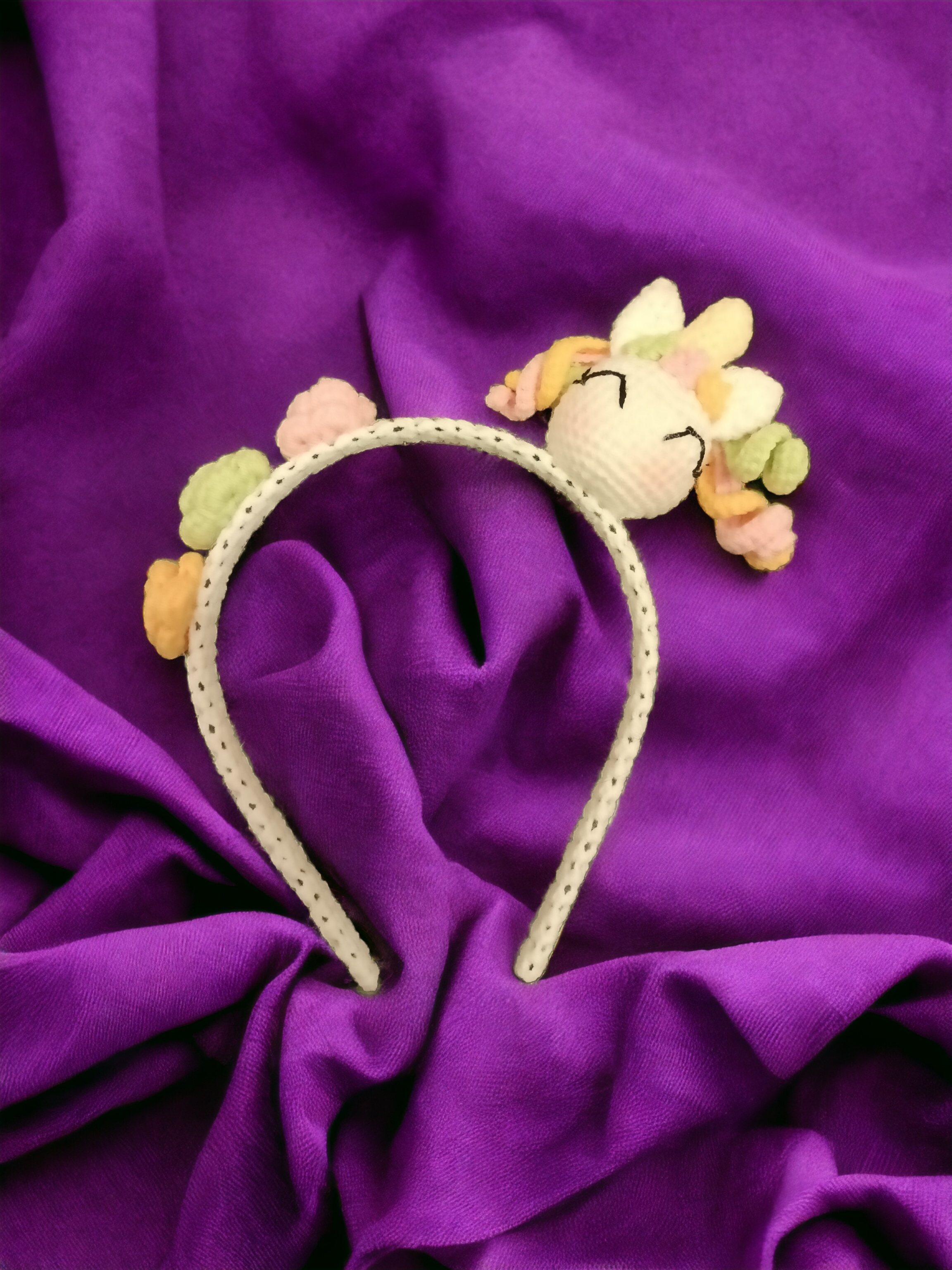 Amigurumi tekniği ile örülmüş Unicorn figürlü çocuk tacı